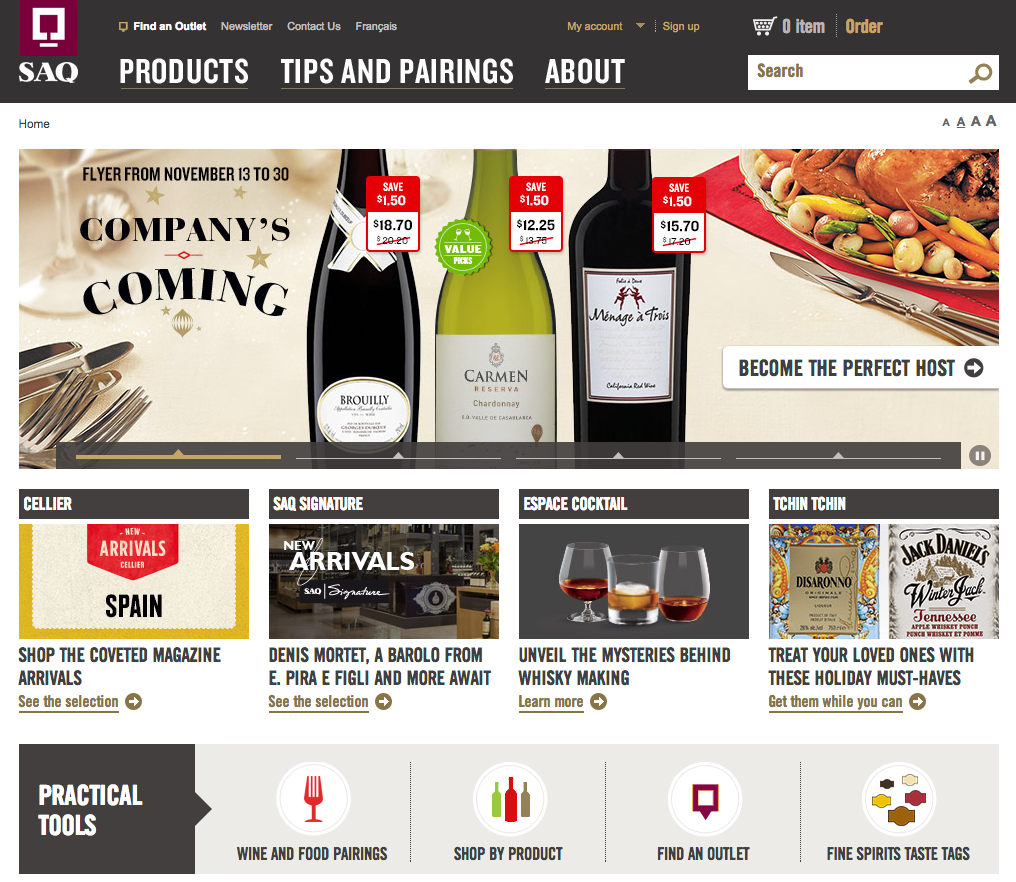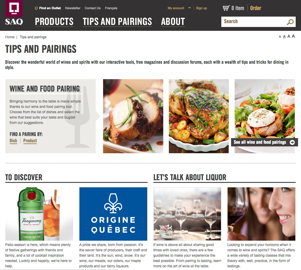 SAQ.com brings great advice to wine and sprits lovers. It immerses internet users into a lifestyle experience with delicious wine pairings, inspiring content about the different wines and spirits regions around the world, cocktails recipes, the latest arrivals, all in a powerful e-commerce platform with thousands of bottles to choose from.