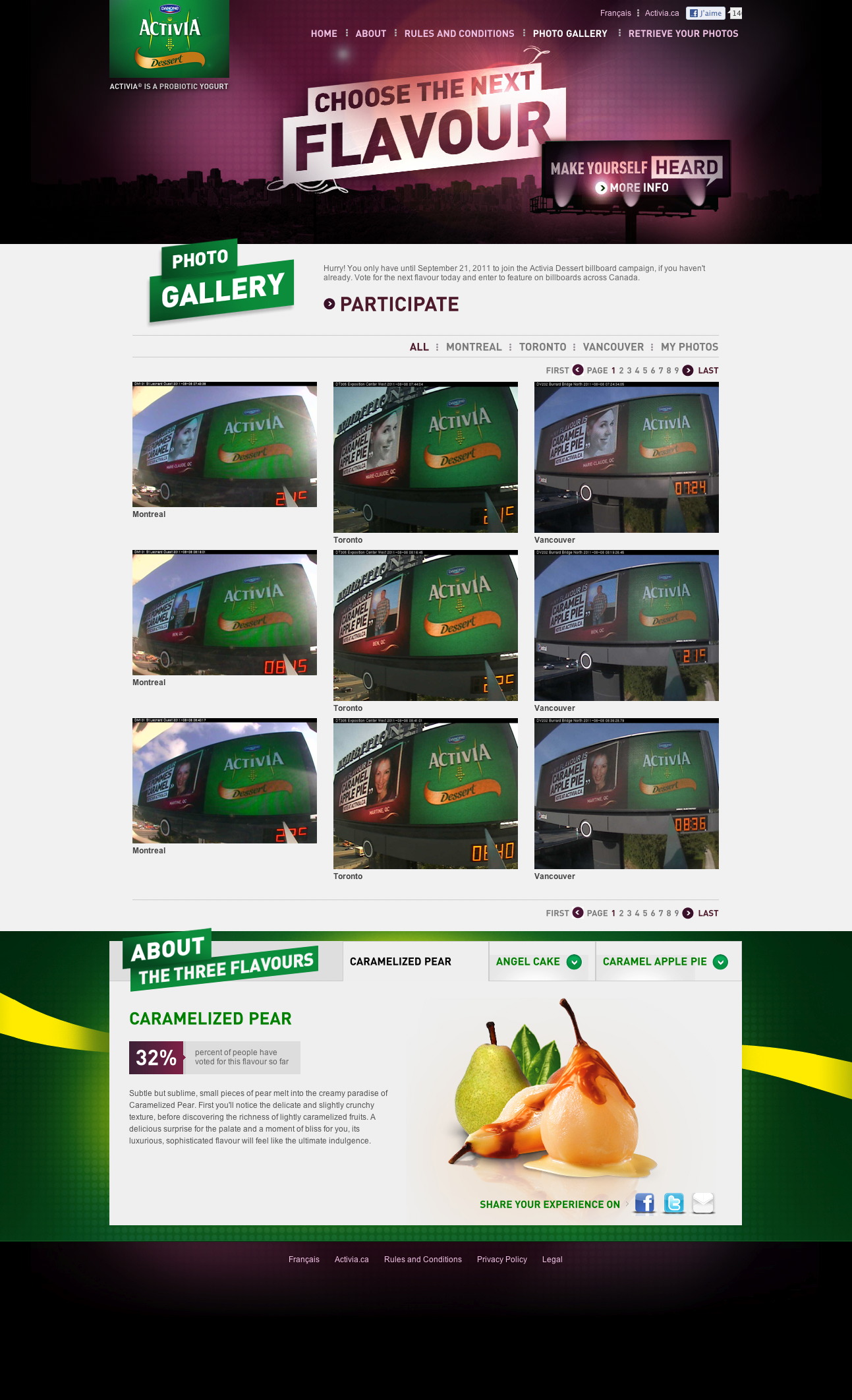 Participants voted and sent their face picture on the Activia website. Their vote and face picture would appear on digital billboards across Canada. The billboard’s security camera would take a picture of the billboard and send it back to the participant via email and Facebook. Each voter had its moment of glory when sharing his/her face picture on a busy billboard.
